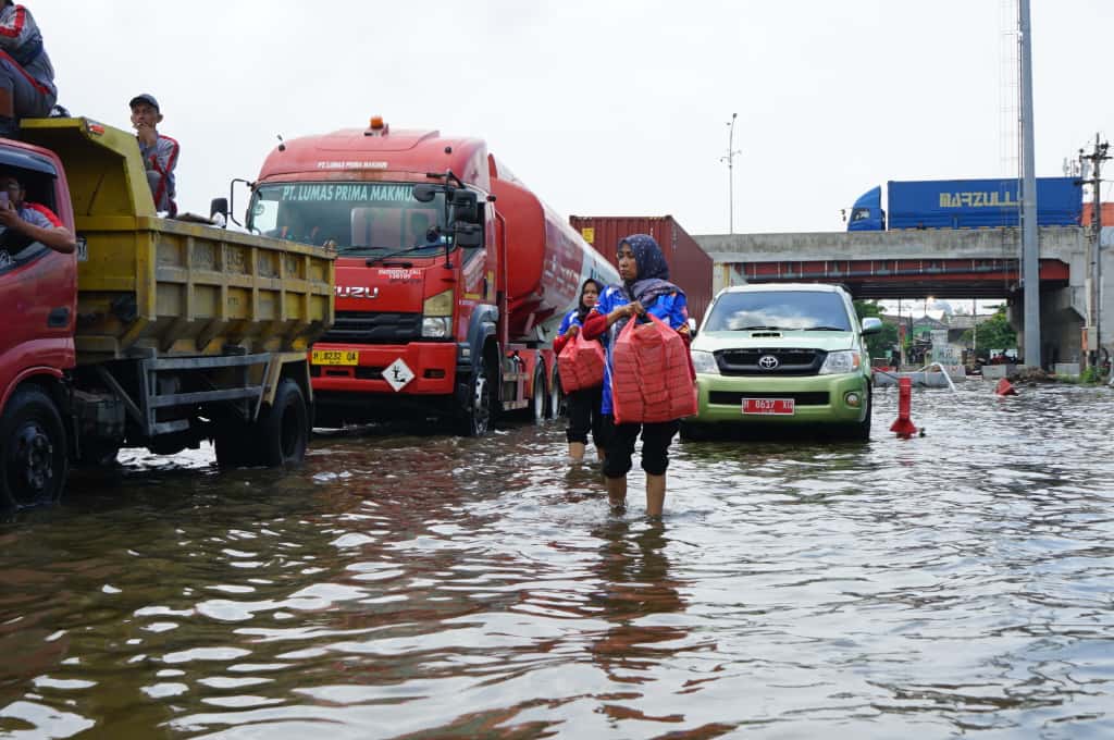 Mereka membantu para sopir truk, kontainer, dan pengguna jalan yang terjebak banjir di lokasi tersebut. Bantuan itu pun disambut para sopir yang menerimanya.