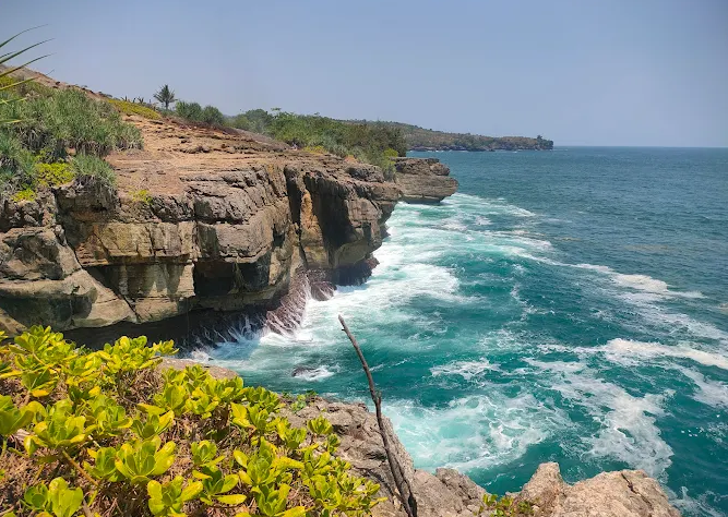 Dari atas tebing, pengunjung dapat melihat luasnya Samudera Hindia dengan ombak yang menghantam karang, menciptakan pemandangan dramatis yang jarang ditemukan di tempat lain.