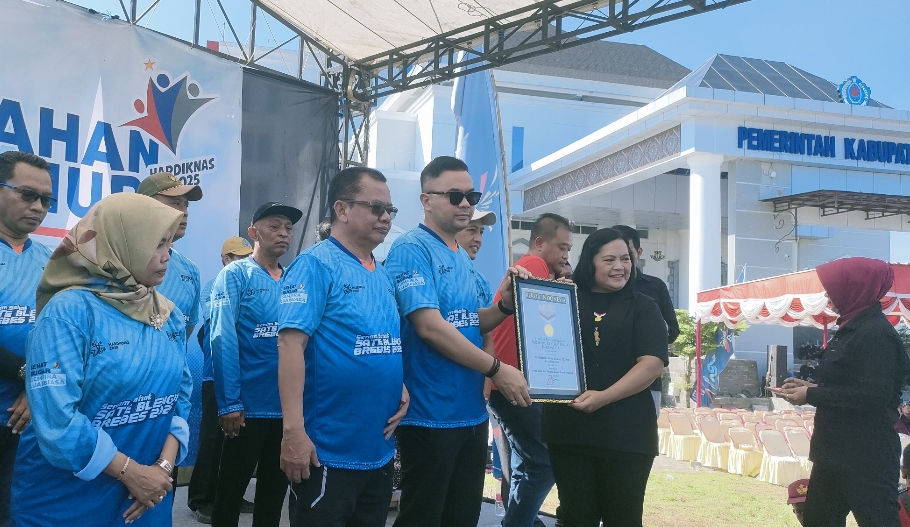 BREBES, radartegal.com - Peringatan Hari Pendidikan Nasional (Hardiknas) 2025 di Kabupaten Brebes sangat spesial. Pasalnya, pada momen itu, Pemkab Brebes berhasil memecahkan rekor muri dengan kategori peserta Senam Sehat Sate Blengong terbanyak, Jumat 2 Mei 2025.