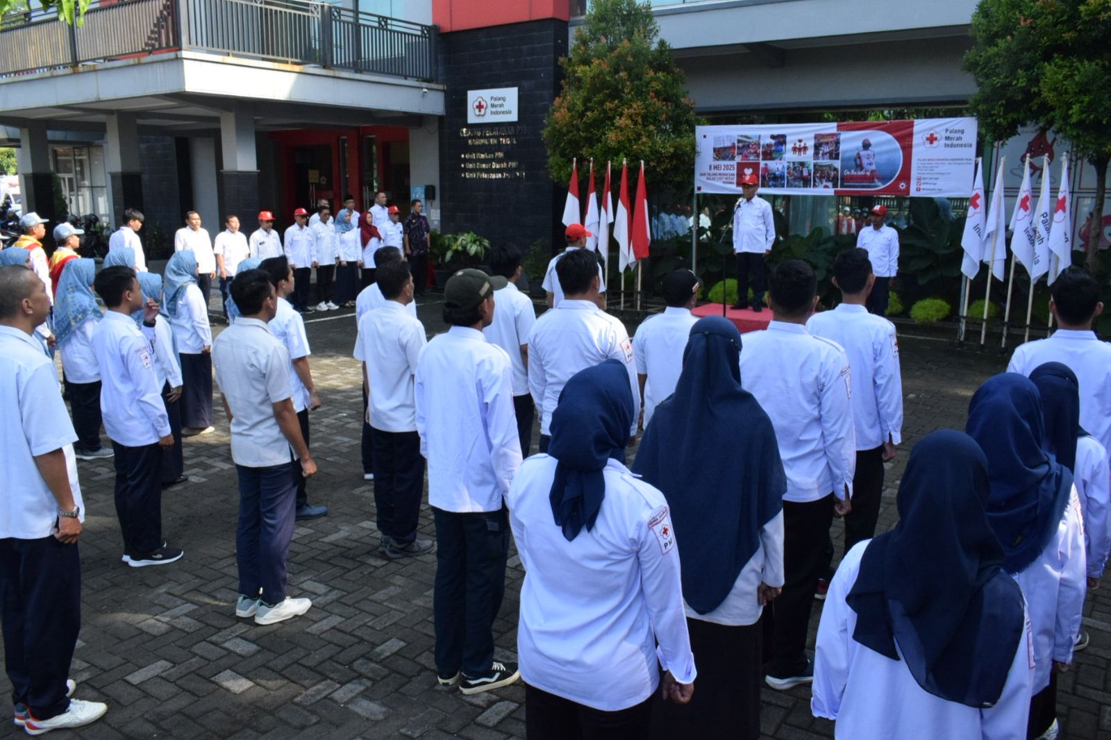 APEL - Ketua PMI Kabupaten Tegal Iman Sisworo memimpin Apel HUT ke-162 Palang Merah dan Bulan Sabit Merah Sedunia Tahun 2025, di halaman Gedung PMI Kabupaten Tegal, Kamis, 8 Mei 2025 pagi.-Yeri Noveli-radartegal.disway.id