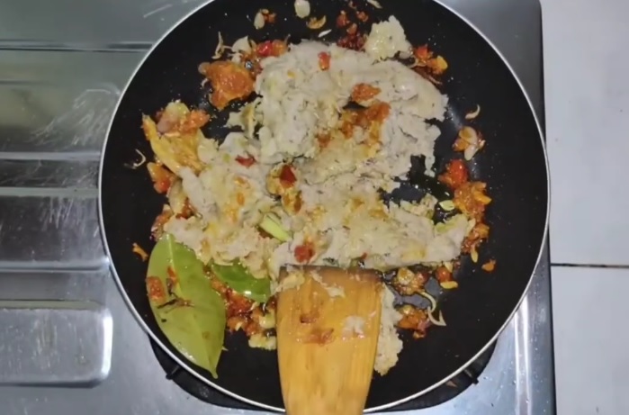 5. Masukan Gembus : Masukan gembus ke dalam tumisan bumbu, aduk rata.