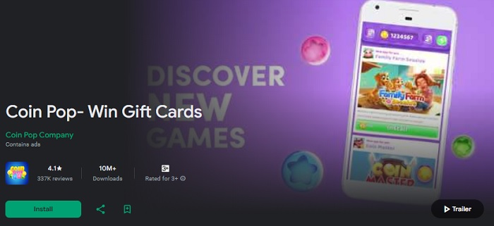 Aplikasi game gratis yang membayar uang tunai lainnya ada Coin Pop. Di Aplikasi ini, Anda bisa memainkan game untuk dapat uang atau hadiah virtual lainnya seperti voucher Amazon, Google Play, dan lainnya.
