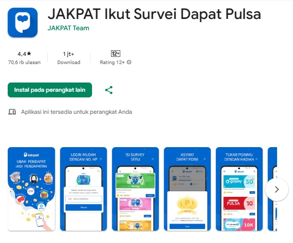 Jajak Pendapat (JAKPAT) merupakan platform survey lokal Indonesia yang tidak hanya menawarkan uang tunai. Disini Anda berkesempatan dapat pulsa, voucher, dan lainnya.