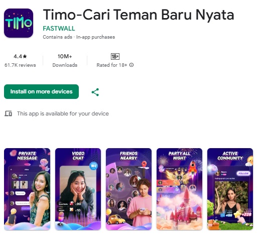 Rekomendasi lainnya ada Timo yang merupakan aplikasi chat untuk cari teman baru sekaligus mencari penghasilan. Ada beberapa misi yang bisa Anda lakukan di Timo, seperti mengerjakan misi harian, check-in harian, undang teman, dan aktivitas obrolan dengan orang-orang lain di Timo.
