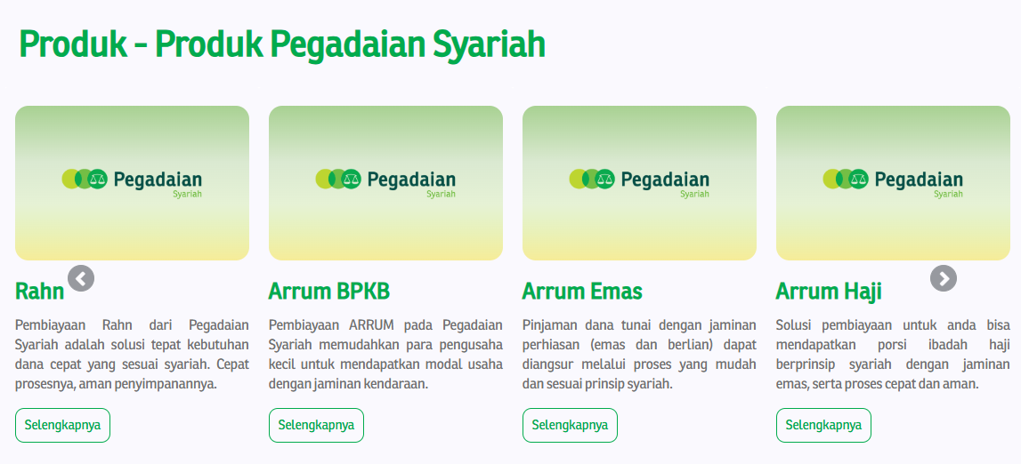 Pegadaian Syariah menyediakan produk pembiayaan tanpa bunga dengan skema Rahn (gadai syariah), di mana nasabah hanya membayar biaya pemeliharaan atau penyimpanan barang yang dijaminkan.