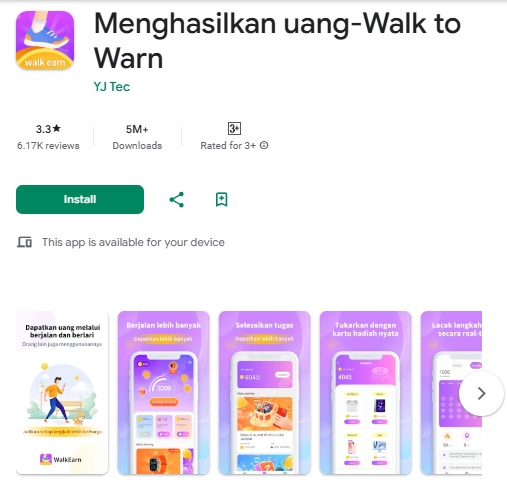 Rekomendasi aplikasi penghasil uang kebugaran ini bisa Anda download gratis di Google Play Store. Cocok untuk Anda berolahraga tapi bisa sambil menghasilkan uang.