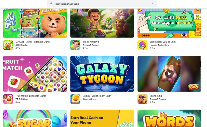 Jika Anda tertarik ingin mencoba game yang bisa menghasilkan uang, coba gunakan beberapa platform seperti Island King, Mager, Tap Coin, dan sejenisnya. Jika Anda ingin mencari aplikasi seperti ini, ketikan ‘game penghasil uang’ di Play Store.