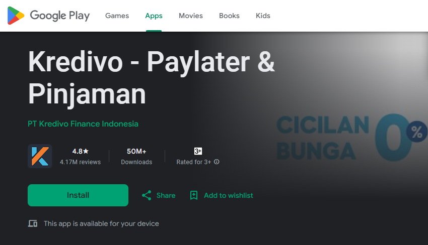 Aplikasi ini menawarkan berbagai opsi pinjaman dengan bunga rendah, dan salah satu keunggulannya adalah program cicilan 0% untuk pembelian di beberapa e-commerce yang bekerja sama dengan Kredivo.