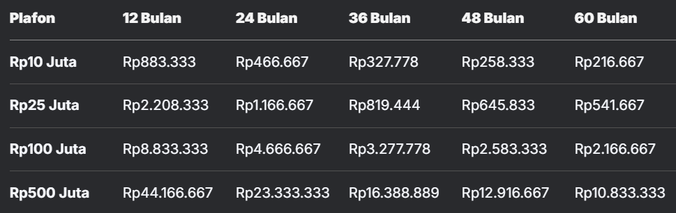 Catatan: Angsuran dihitung berdasarkan bunga flat. Pinjaman pertama dapatkan suku bunga terendah.