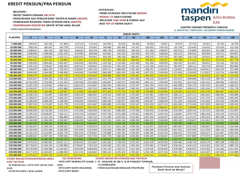 Mandiri Taspen menyediakan plafon hingga Rp500 juta dengan bunga bersaing, serta cicilan yang bisa disesuaikan dengan kemampuan bayar.