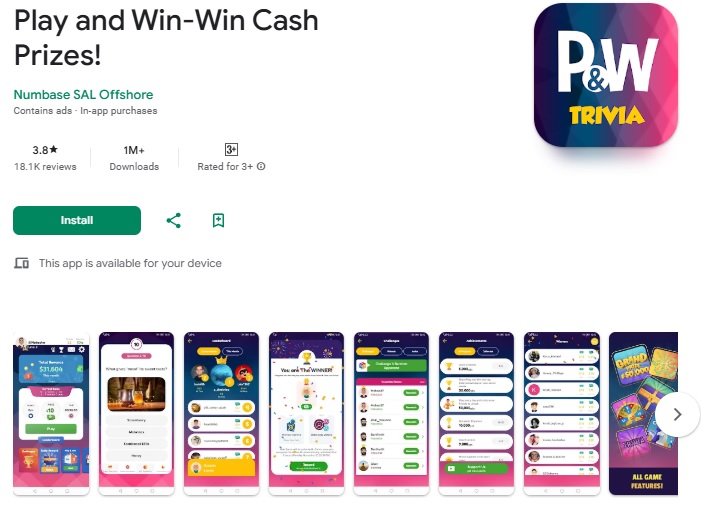 "Play and Win-Win Cash Prizes!" merupakan aplikasi trivia gratis, dengan imbalan uang tunai dalam bentuk saldo e-wallet. Syaratnya pemain harus jawab pertanyaan yang diberikan.