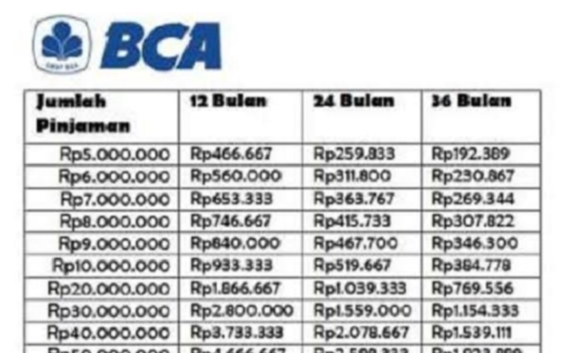Berikut perkiraan angsuran untuk Pinjaman 100 Juta di KUR BCA:
