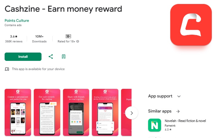 Rekomendasi berikut ini memiliki rating di atas 4 yang juga sudah terkenal khususnya di kalangan muda yang hobi baca. Cashzine merupakan aplikasi novel yang bisa memberikan imbalan ke penggunanya.
