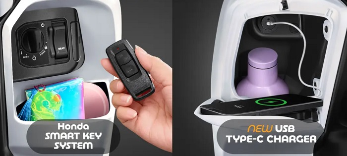 Ada juga alarm dan answer back system untuk memudahkan mencari motor saat parkir, serta meningkatkan keamanan ekstra. Scoopy juga sudah memiliki power charger di laci tertutup yang lebih aman.