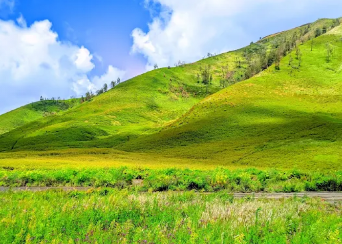 Hamparan rumputnya begitu luas, berpadu dengan langit biru cerah dan kabut tipis yang sering turun di pagi hari. Suasana ini membuat siapa pun betah berlama-lama menikmati ketenangan alam.