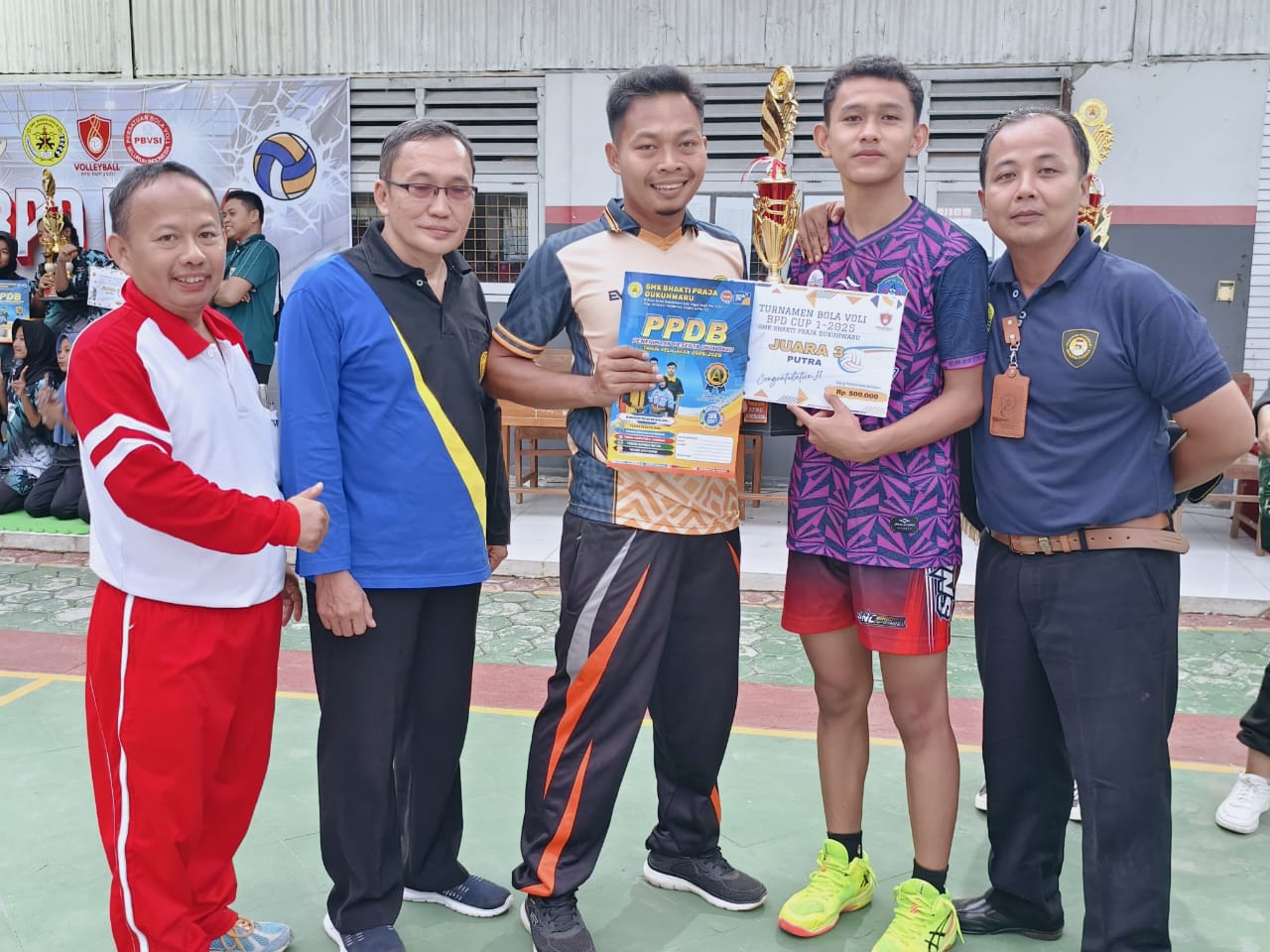 HADIAH - Kepala SMK BPD Kabupaten Tegal Sarwo Edy Pranoto menyerahkan hadiah kepada pemenang Turnamen Bola Voli, di SMK BPD setempat, Kamis, 27 Februari 2025. -Yeri Noveli-radartegal.disway.id