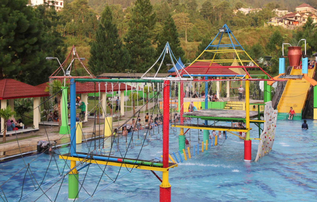 Berada di kaki Gunung Slamet, tempat ini menggabungkan pemandian air panas dengan wahana modern. Kolam renang mini beratap sangat aman untuk balita.