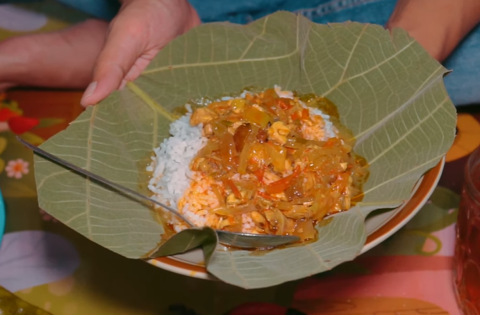 - Nasi putih yang disajikan di atas daun jati, memberikan aroma unik sekaligus menjaga nasi agar tidak mudah cepat basi.