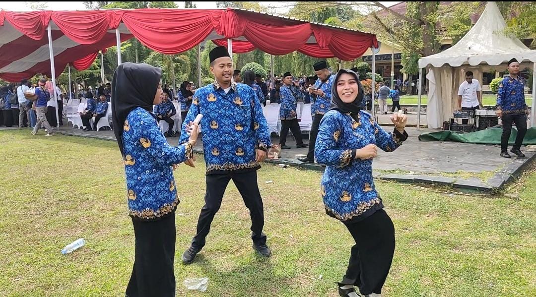 JOGET - Novi Arum Wulandari berjoget bersama teman-temannya usai menerima SK PPPK Paruh Waktu, di Lapangan Pemkab Tegal, Rabu 3 Desember 2025. -Yeri Noveli-radartegal.disway.id