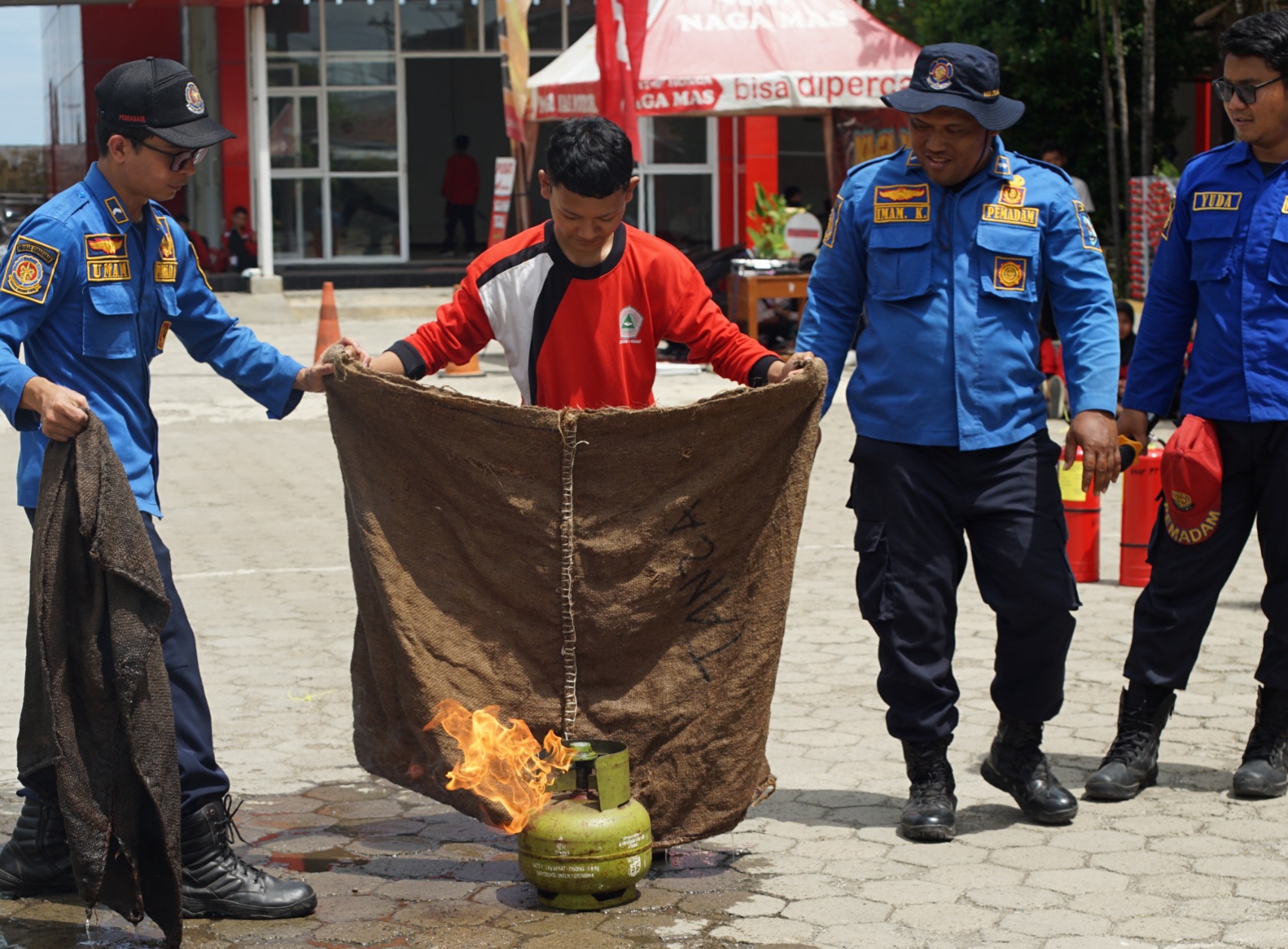 Setelah itu, Damkar Kab. Tegal mengajarkan simulasi pemadaman api pada kebakaran gas di dapur yang erat dengan kehidupan sehari-hari, penggunaan APAR, karung goni basah, dan penyampaian materi first aid.