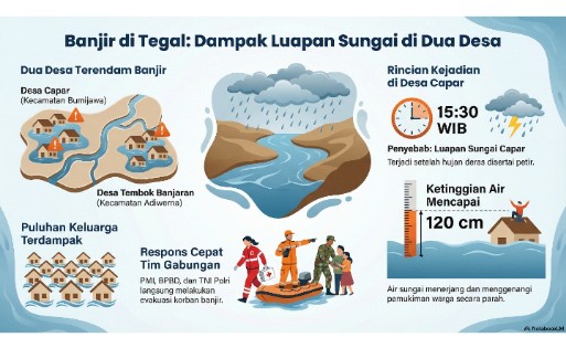 Pemukiman warga dua desa di Tegal yang terendam banjir pada Selasa, 23 Desember 2025, yakni di Desa Capar Kecamatan Bumijawa dan Desa Tembok Banjaran, Kecamatan Adiwerna.