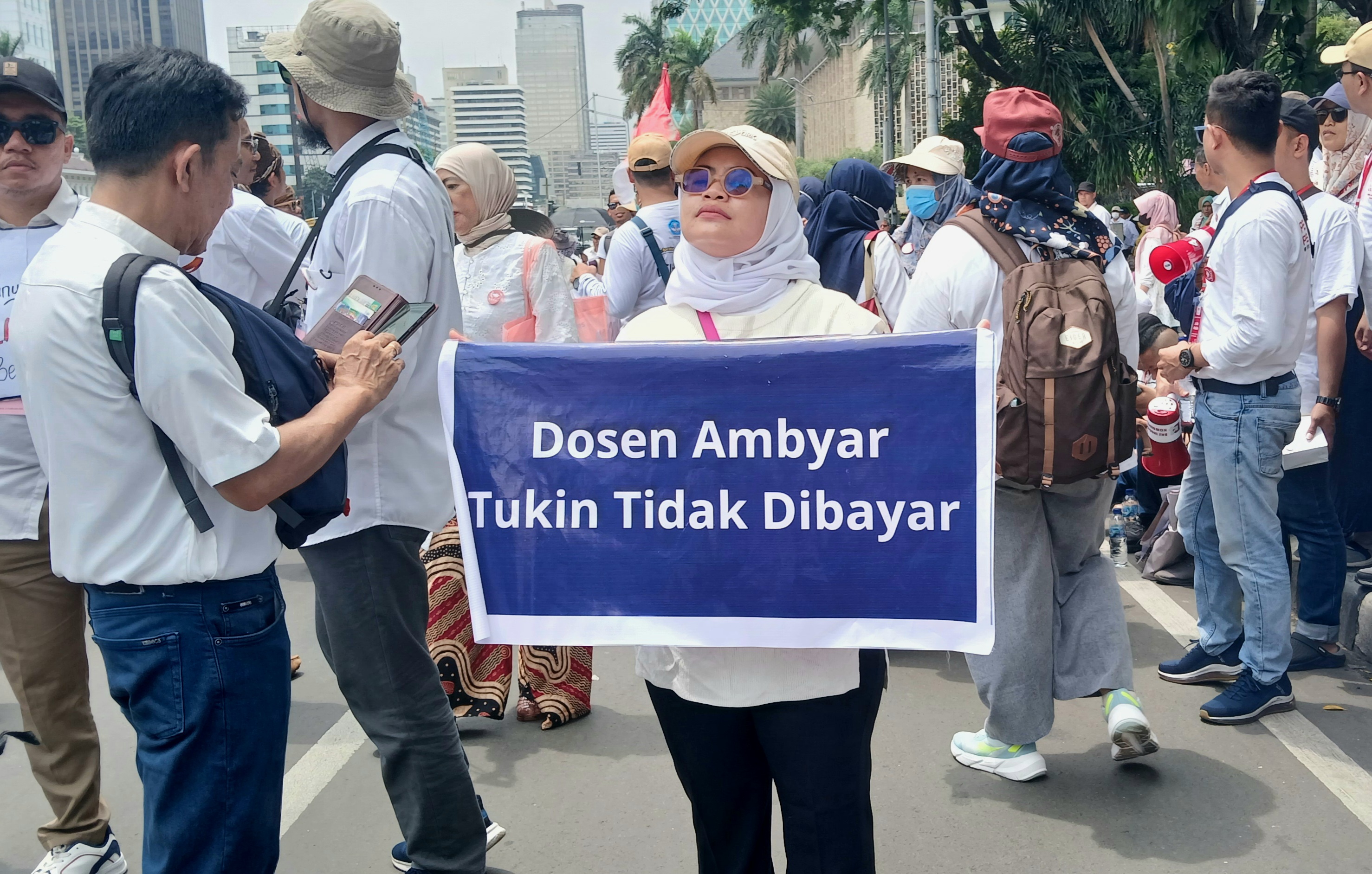Hal itu terungkap saat ratusan dosen ASN Kemdiktisaintek menggelar aksi unjuk rasa di kawasan Patung Kuda Arjuna Wiwaha, Jalan Medan Merdeka Barat, Gambir, Jakarta Pusat pada Senin, 3 Februari 2025 hari ini.