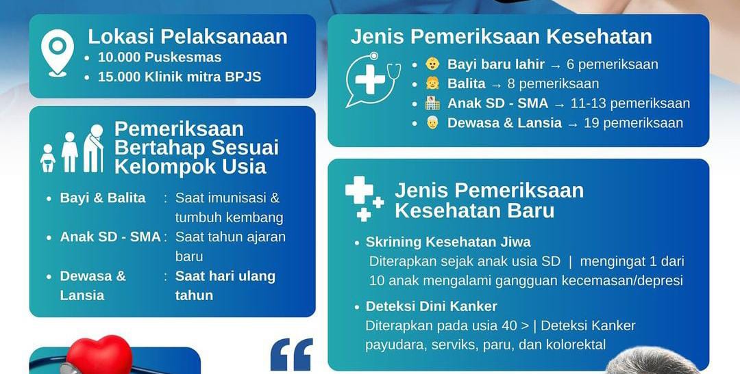 Cek Kesehatan Gratis ulang tahun akan dimulai pada 10 Februari 2025 dan melibatkan pemeriksaan untuk anak usia 0-6 tahun serta masyarakat usia 18 tahun ke atas. pemeriksaan kesehatan ini akan dilakukan di puskesmas dan klinik yang telah bekerjasama.