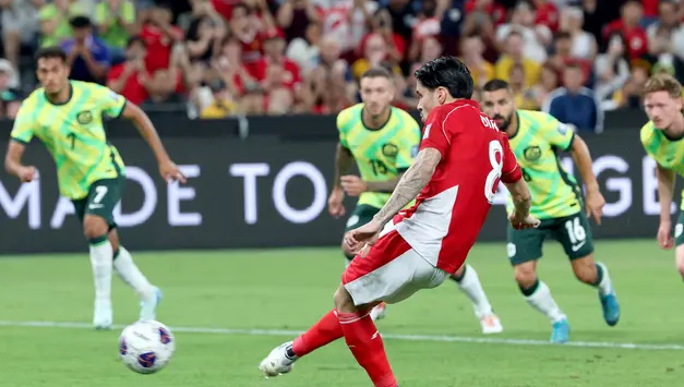 Kevin Diks menendang penalti ke gawang Australia namun gagal. Timnas Indonesia kalah 1-5 di Allianz Stadium, Sydney, Kamis (20/3/2025). -(AFP/David Gray)-
