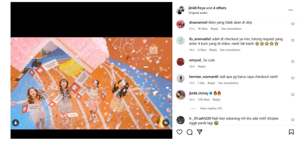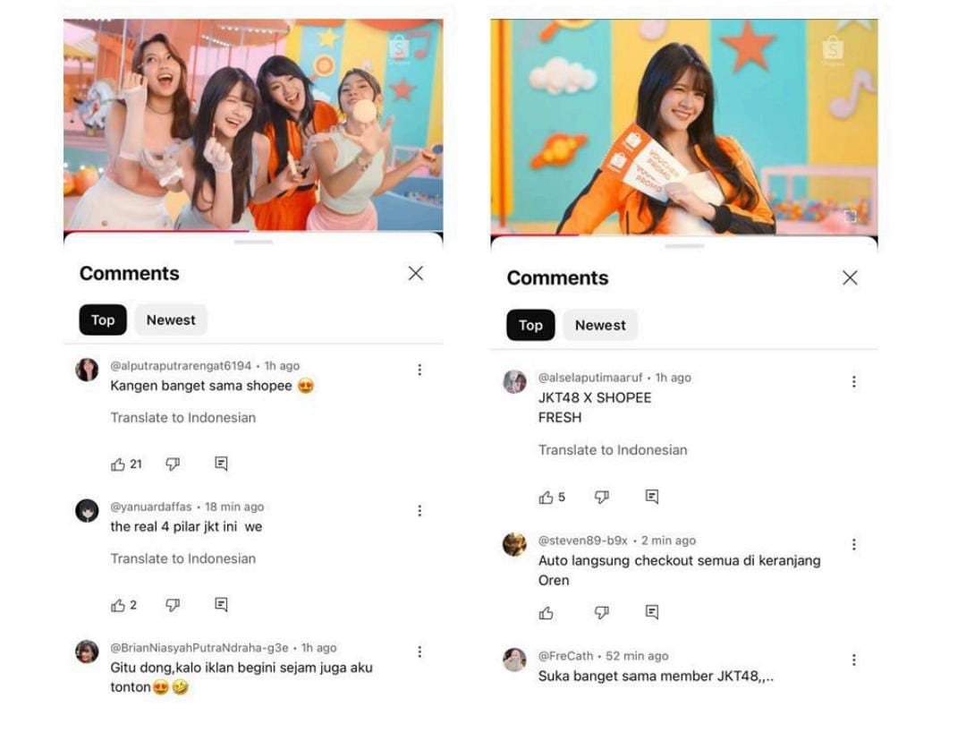 Tak sedikit pula yang mengungkapkan bahwa mereka sangat suka iklan terbaru Shopee dan JKT48 karena visual dan energinya yang menyenangkan. Bahkan saking serunya, para member JKT48 juga membagikan ulang cuplikan MV tersebut di media sosial pribadi mereka, menunjukkan antusiasme dan kebanggaan terhadap kolaborasi ini.