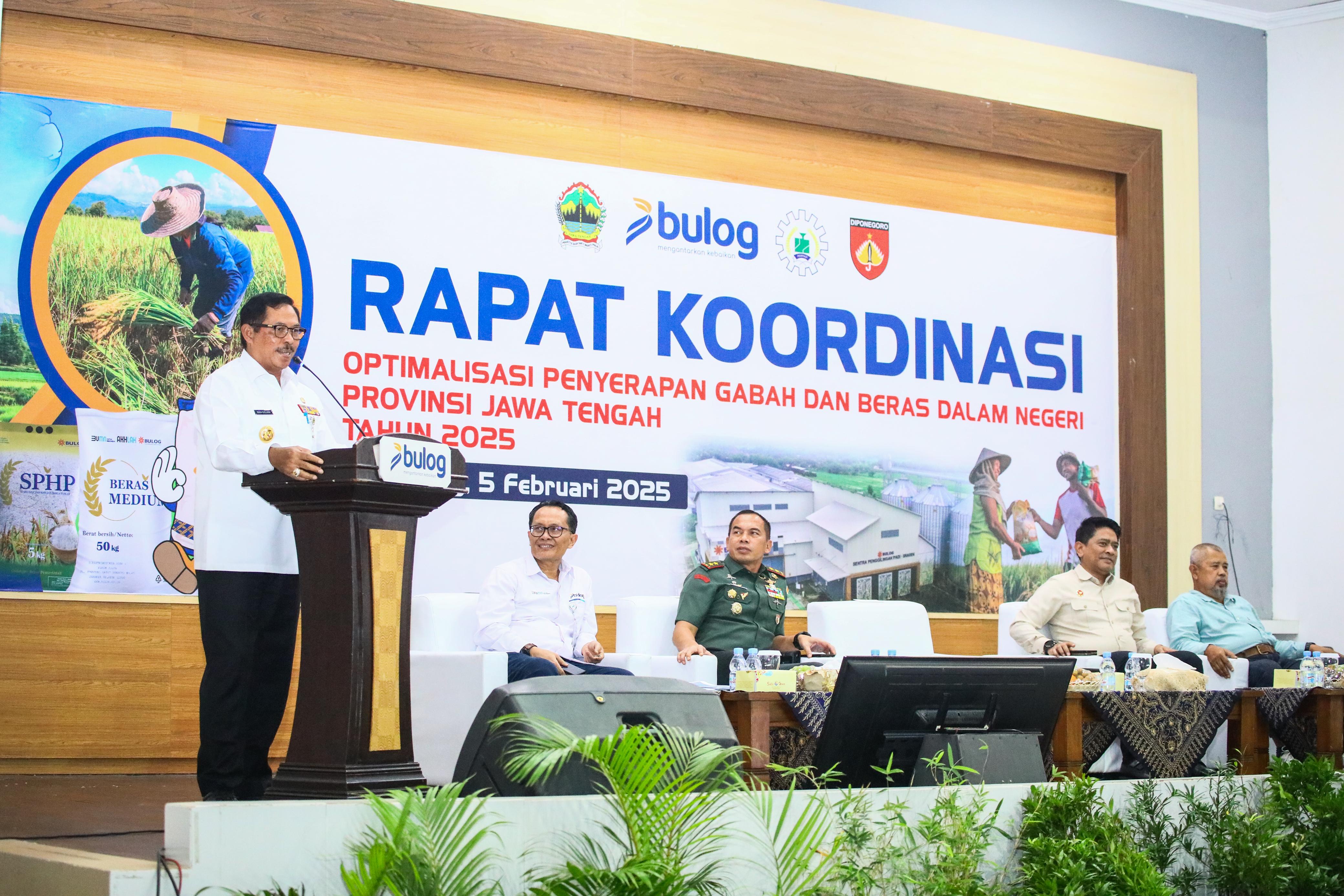 RAKOR- Pj Gubernur Jawa Tengah Nana Sudjana, dalam Rakor Optimalisasi Penyerapan Gabah dan Beras Dalam Negeri Provinsi Jawa Tengah, di Kantor Perum Bulog Kantor Wilayah (Kanwil) Jateng pada Rabu, 5 Februari 2025. -ISTIMEWA-radartegal.disway.id